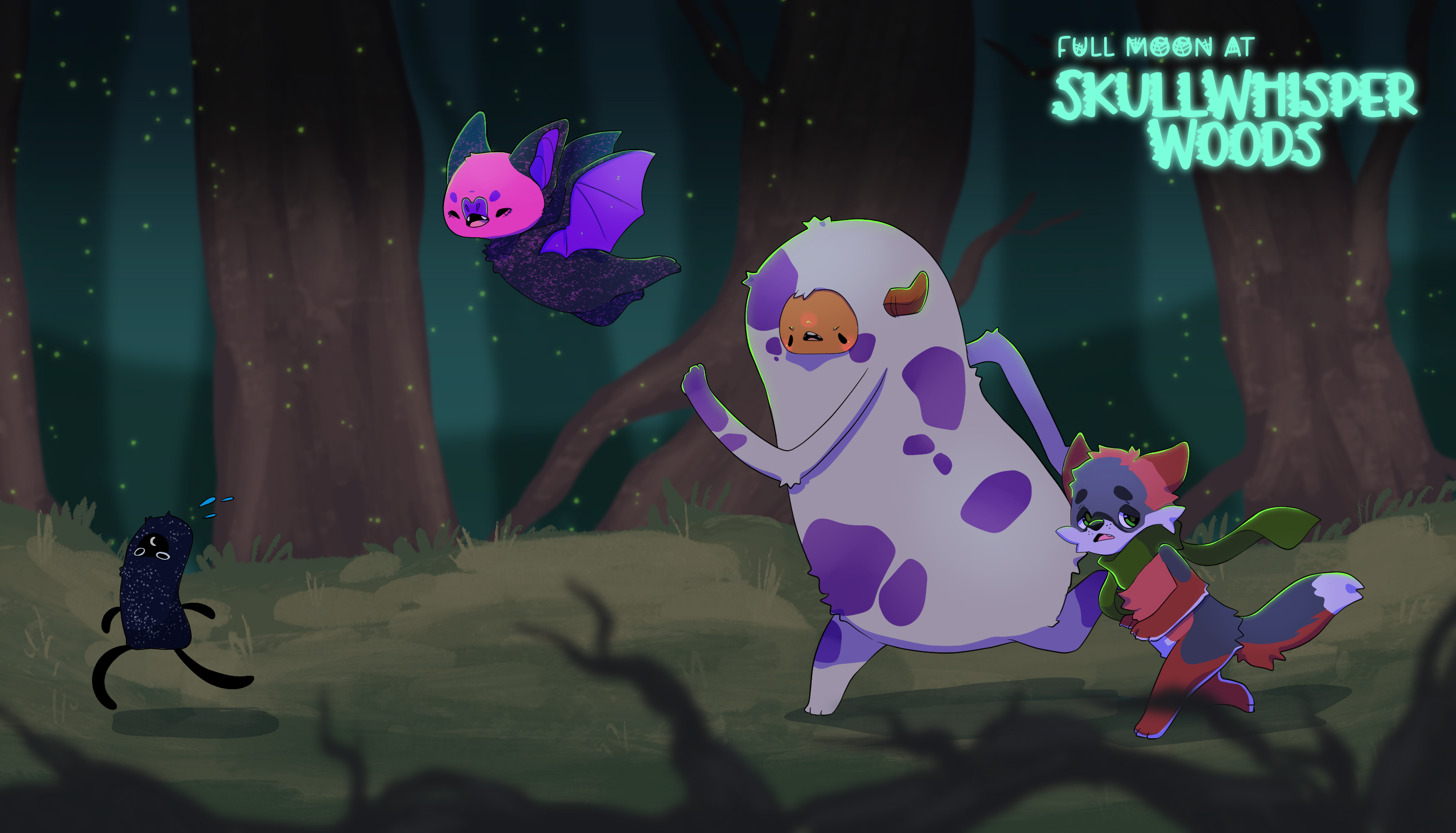The entry to the SkullWhisper Woods is no entry at all. It’s full of twisted trees with sharp branches. The night is still but alive with the sounds of all that crawls and creeps in those woods. They were the type of woods that, if you stared into their darkness, the darkness stared back at you. In this case, the darkness was staring back at a young MoonSugrr named Dylan. Dylan stood holding a flashlight challenging the darkness to give him some answers to where Clark, his older brother, might have gone. Accompanying Dylan are his two ride-or-die friends, the adventurous & tough Rini (a bat resident) and the cautious & germ-conscious Oliver (a fox resident).